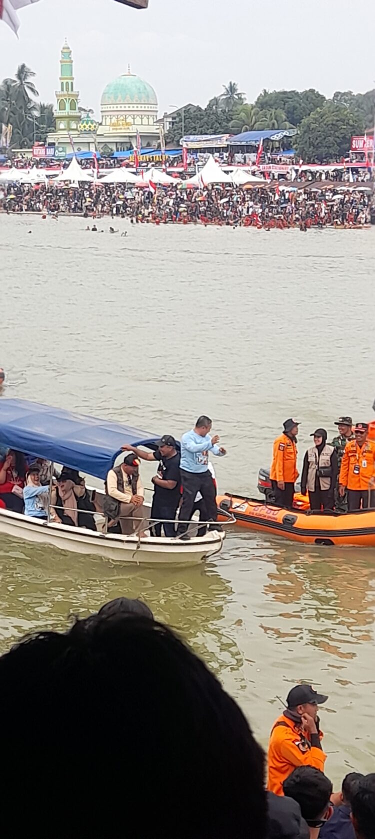 Gubernur Abdul Wahid menyapa warga yang mamadati aliran sungai dengan menaiki perahu dan mengelilingi arena pacu sambil menarik dan mendadahkan tangan kepada masyarakat.