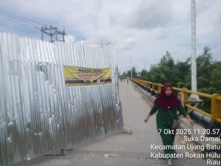 Ironisnya ,Jembatan tersebut sedang dlm perbaiki ,tapi tim media tidak menemukan papan informasi terkait proyek jembatan penghubung antara kecamatan ujung batu Rokan menuju pasir pangaraian