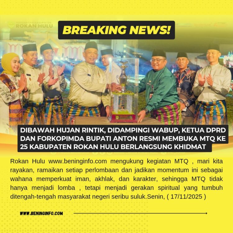 Rohul,Beninginfo.com – Meski diguyur hujan rintik, pembukaan Musabaqah Tilawatil Qur’an (MTQ) ke-25 Kabupaten Rokan Hulu tetap berlangsung khidmat dan penuh antusiasme, Senin (17/11/2025). Bupati Rokan Hulu, Anton, secara resmi membuka gelaran akbar tersebut bersama Wakil Bupati, Ketua DPRD, dan unsur Forkopimda.