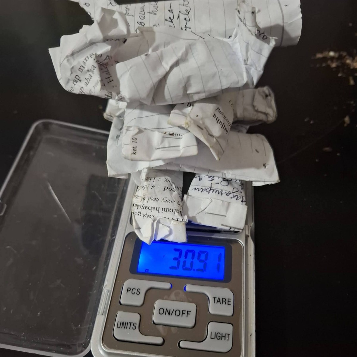 Dari penggeledahan, petugas menemukan barang bukti yang cukup lengkap. Ditemukan 3 bungkus plastik klip kecil yang diduga berisi narkotika jenis sabu dengan berat bruto 0,47 gram, 8 bungkus yang diduga berisi narkotika jenis ganja dengan berat bruto 30,91 gram, 4 buah kaca pirex yang berisi sisa diduga narkotika jenis sabu, dan berbagai alat hisap sabu.
