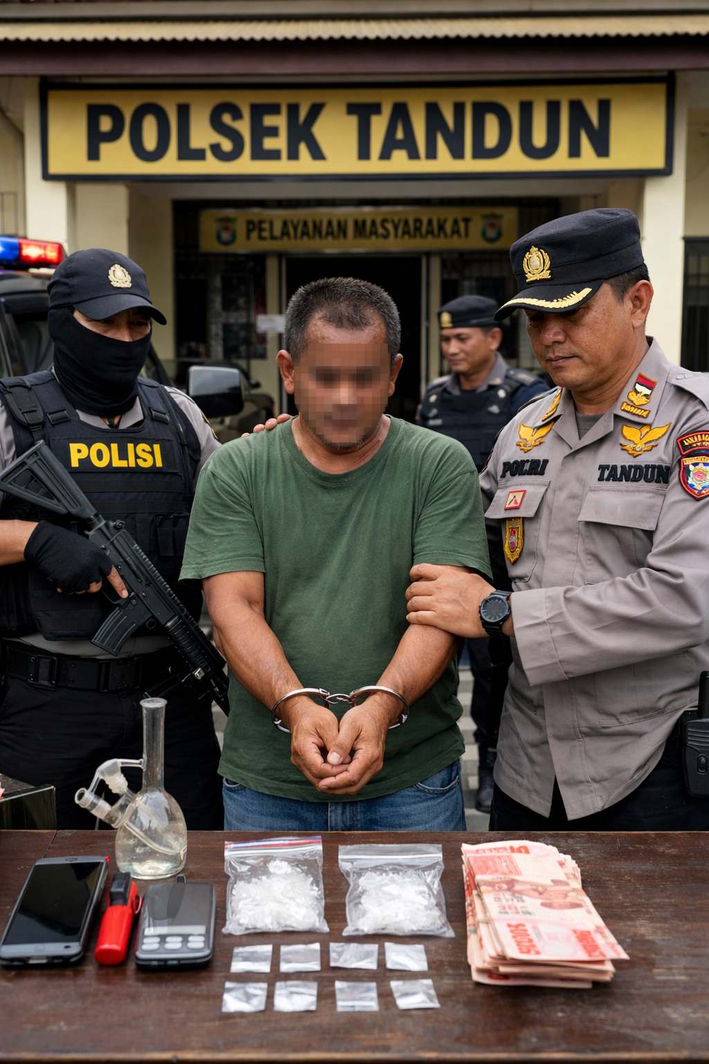 Dalam penggerebekan yang dipimpin langsung Kapolsek Tandun tersebut, polisi berhasil mengamankan tersangka S yang diketahui berprofesi sebagai wiraswasta. Dari tangan pelaku, petugas menemukan dua paket sedang diduga narkotika jenis sabu dengan berat kotor sekitar 0,84 gram.
