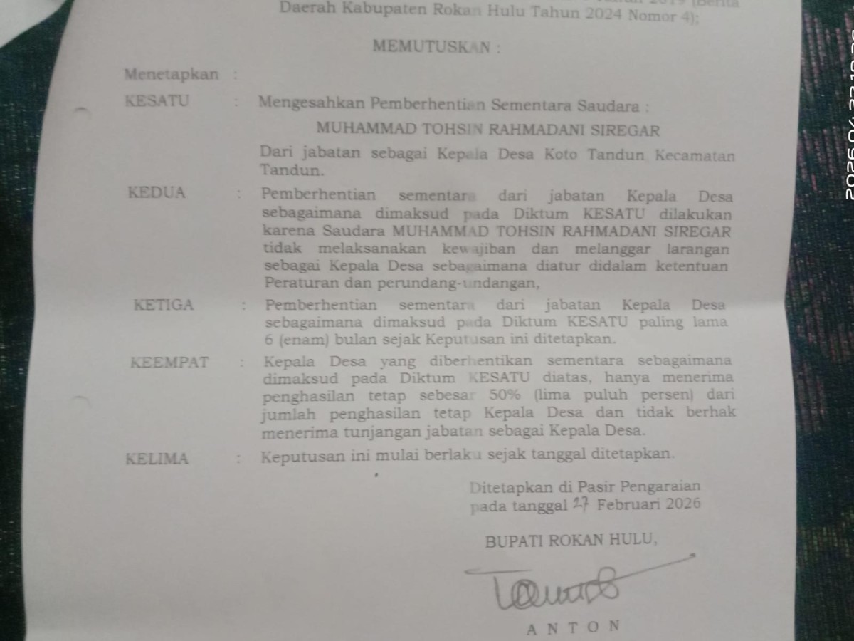 Selain itu, Muhammad Tohsin Rahmadani sudah diberhentikan sementara dari jabatannya sebagai Kades Koto Tandun dengan surat Keputusan Bupati Rohul nomor : Kpts.100.3.3.2/DPMPD-PEMDES/163/2026 tentang pengesahan pemberhentian sementara Kades Koto Tandun Kecamatan Tandun, tertanggal 27 Februari 2026 dan ditandatangani Bupati Rohul Anton.